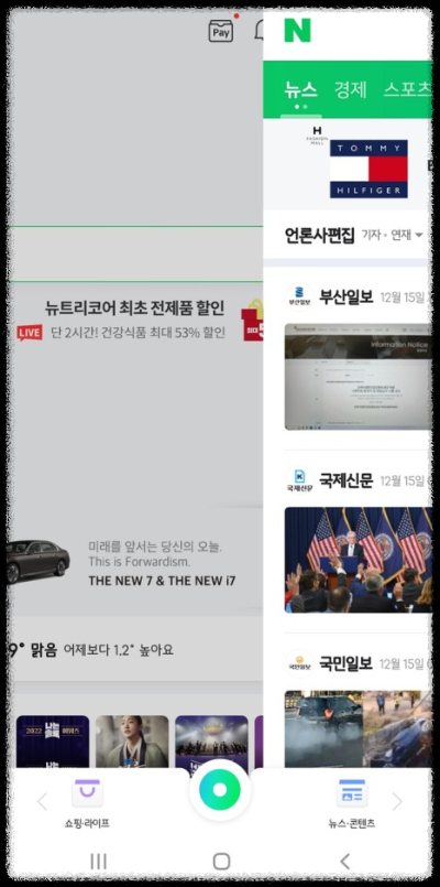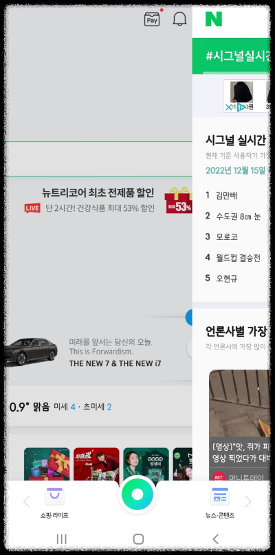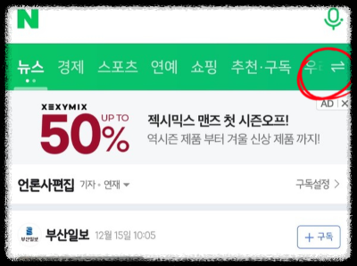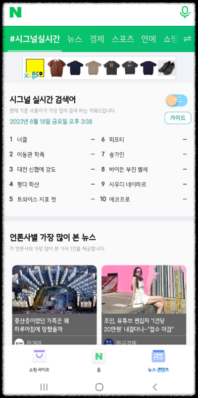 아래는 언론사별 가장 많이 본 뉴스가 나오고예전 네이버 앱을 켰을 땐 오른쪽으로 실시간 검색어가 나오던 거랑은 조금 차이가 있지만 이정도면 훌륭한거 같습니다.