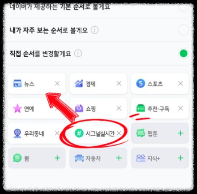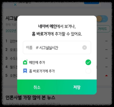 홈 화면 오른쪽에 있는 뉴스 콘텐츠의 카테고리에 시그널 실시간(네이버 실시간 검색어)이 등록되었습니다.