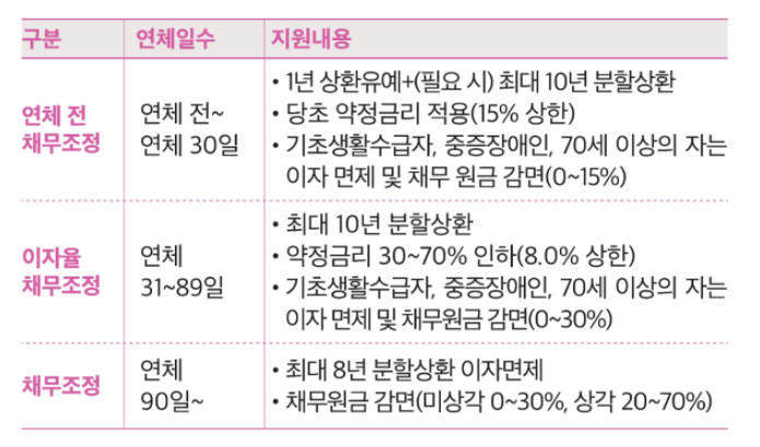 | 연체되기 전 | 아직 갚고 있지만 곧 어려워질 것 같아요 | 1년 동안 잠시 쉬고(상환유예), 최대 10년 나눠 갚기 가능. 이자 감면도 받을 수 있어요. |