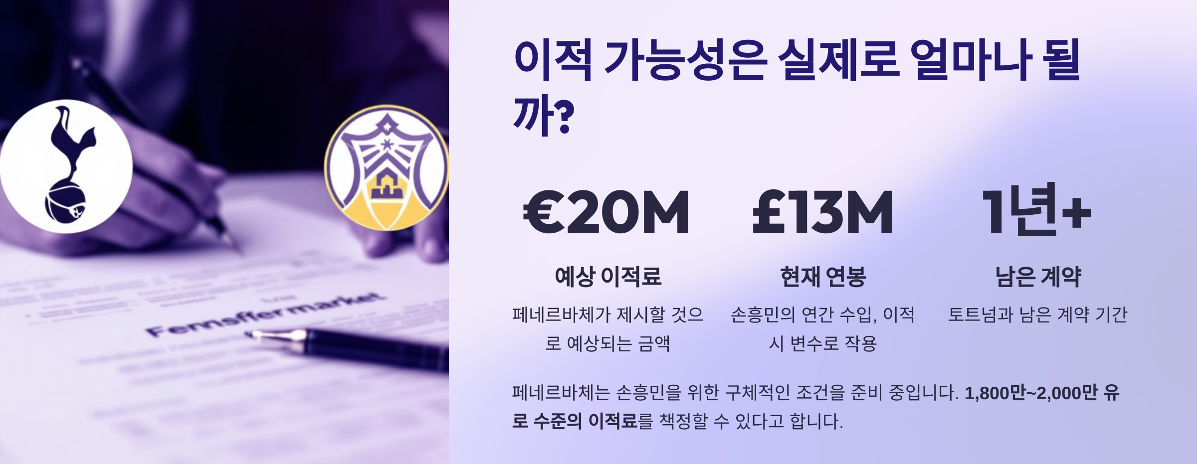 페네르바체는 손흥민을 위한 구체적인 조건을 준비 중이며, 1,800만~2,000만 유로 수준의 이적료를 책정할 수 있다고 합니다.