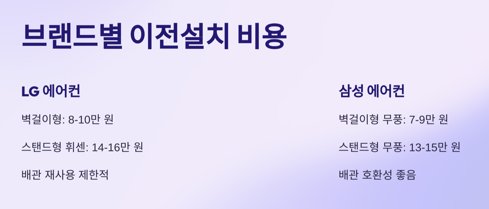 - LG는 배관 재사용이 제한적인 모델이 있어, 신규 배관 추가비용 발생 가능성이 높습니다.