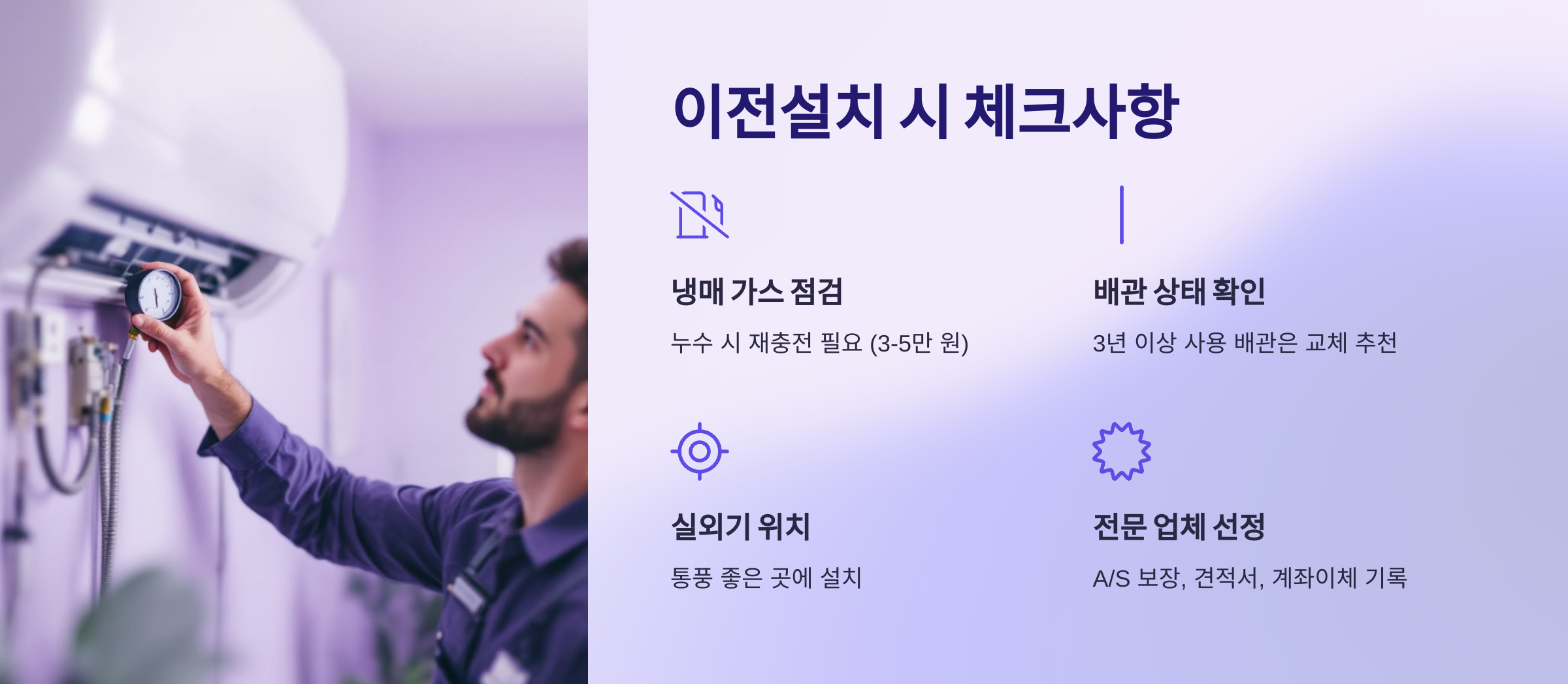 - 냉매 가스 점검 - 재사용 가능한 경우도 있지만, 이전 중 누수가 발생하면 재충전 필요 (약 3~5만 원)