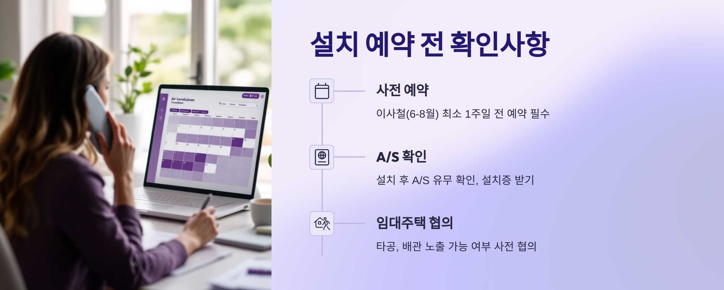 - 이사철(6~8월)은 설치 기사 예약이 폭주하므로 최소 1주일 전 예약 필수