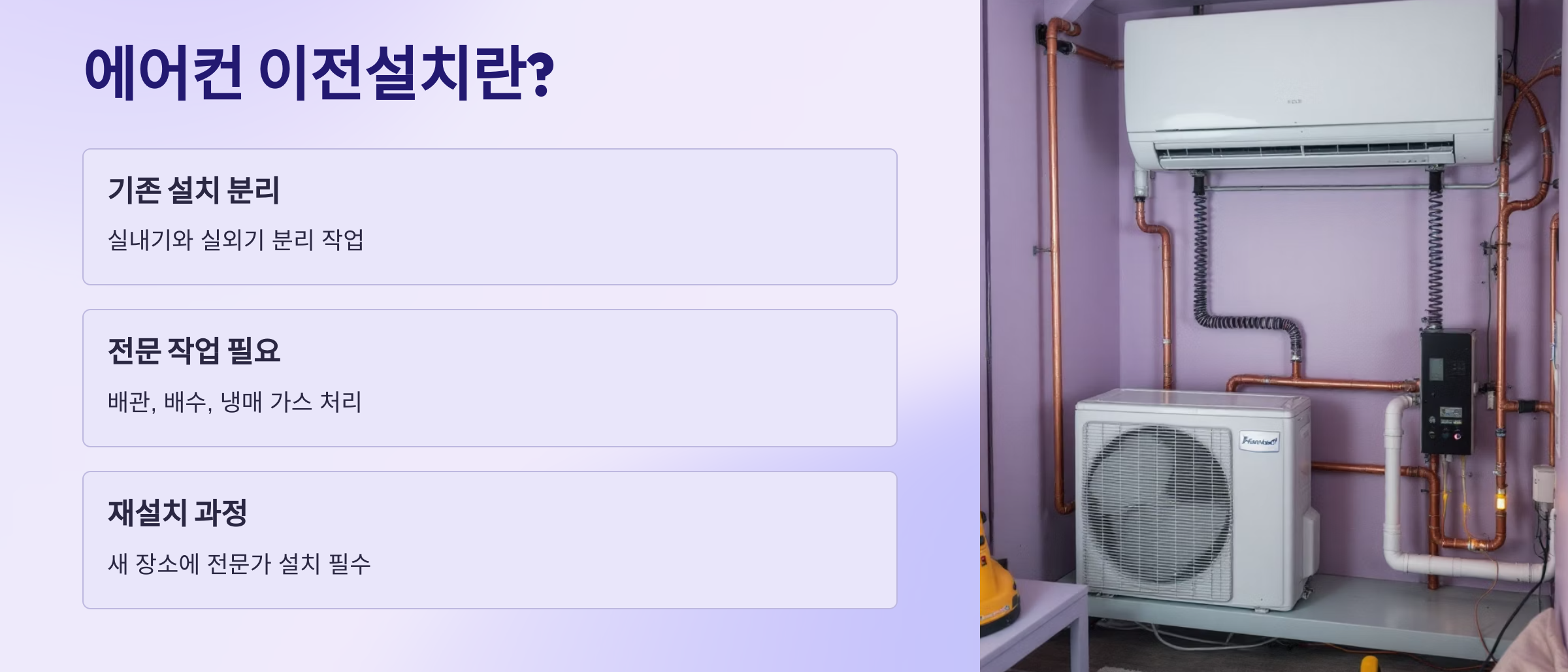 벽걸이형이든 스탠드형이든, 단순 탈부착이 아닌 배관, 배수, 냉매 가스 등 전문 작업이 필요하기 때문에 꼭 전문가의 도움이 필요해요.