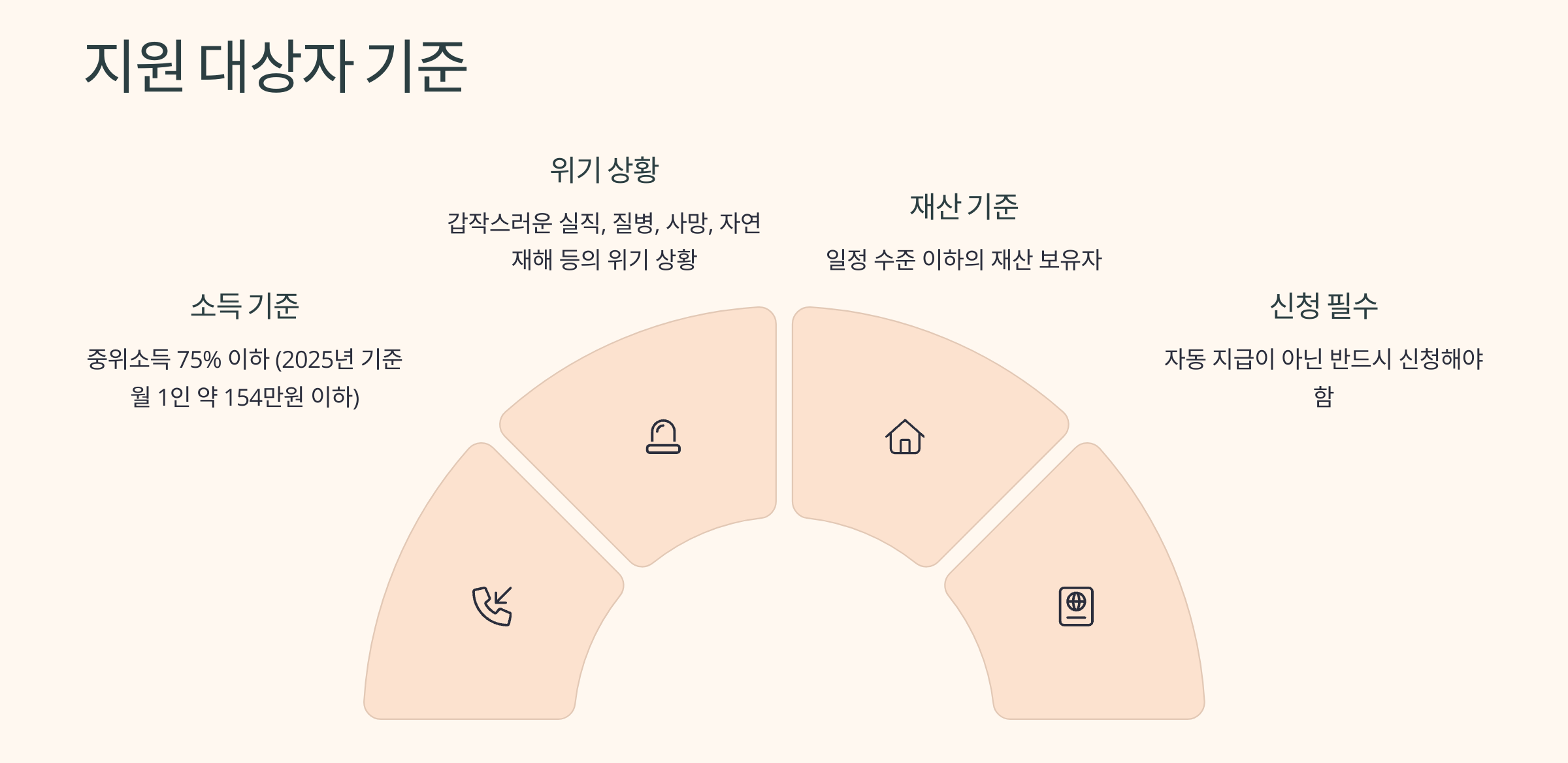 실직, 질병, 사망, 자연재해 등으로 인해 생계가 어려워진 경우, 소득 기준을 충족하면 생계비가 1인 기준 25만 원 이상 지급됩니다.