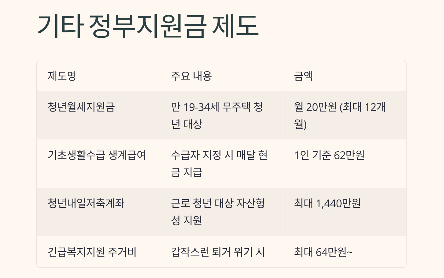 | 청년월세지원금 | 만 19~34세 무주택 청년 대상 | 월 20만 원 (최대 12개월) |