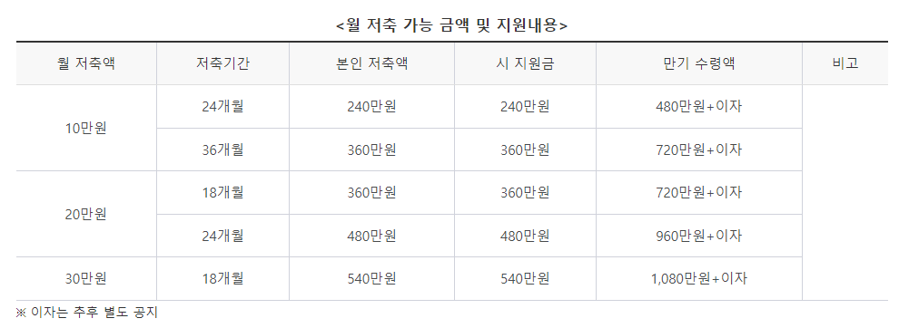 부산광역시에 거주하고 근로소득이 있는 청년이 매월 10~30만원을 18~36개월을 저축하면, 본인 저축액과동일한 금액을 부산시에서 지원하는 것입니다.