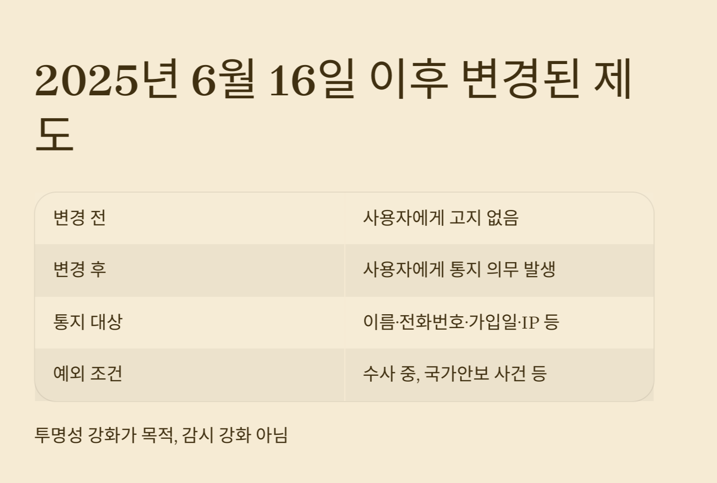 - 2025년 6월 16일부터, 통신자료 요청이 있으면 사후 통지해야 한다는 제도 개편