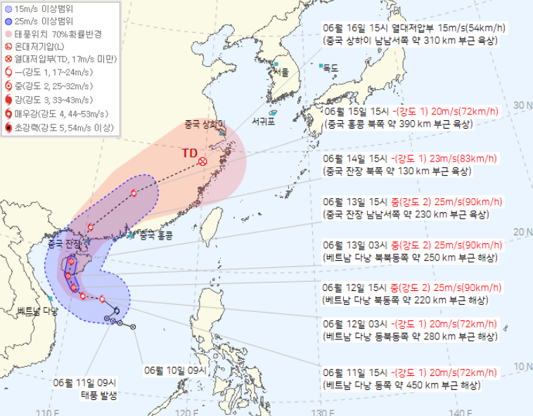 | 6/11 09시 | 16.1°N, 113.7°E | 베트남 다낭 동쪽 해상 | 약 17m/s | 북서진 |