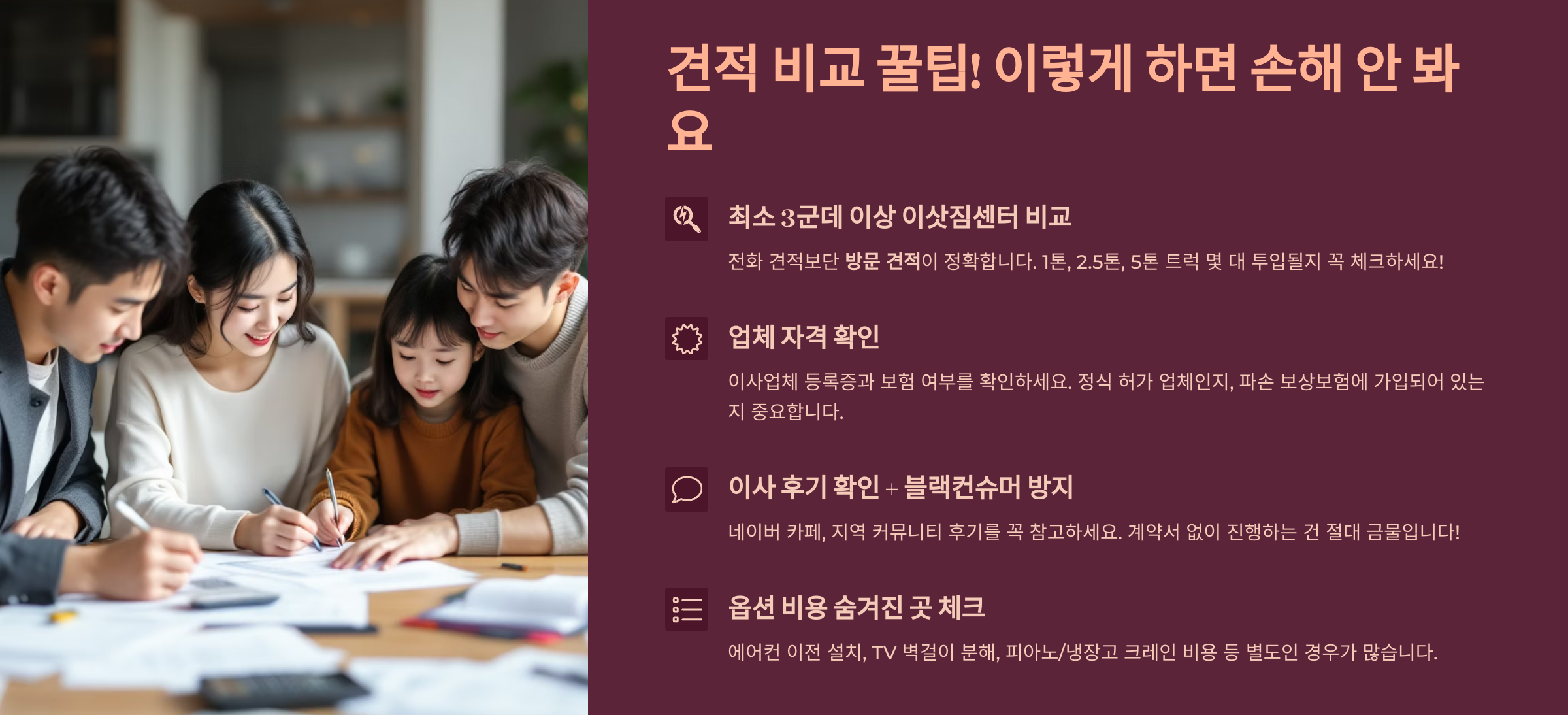 - 최소 3군데 이상 이삿짐센터 비교 – 전화 견적보단 방문 견적이 정확합니다.