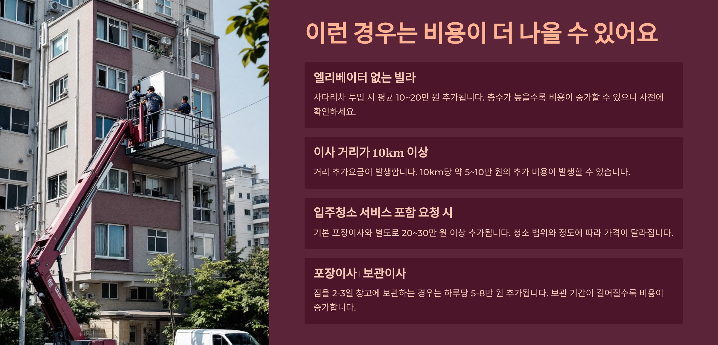 - 엘리베이터 없는 빌라 – 사다리차 투입 시 평균 10~20만 원 추가